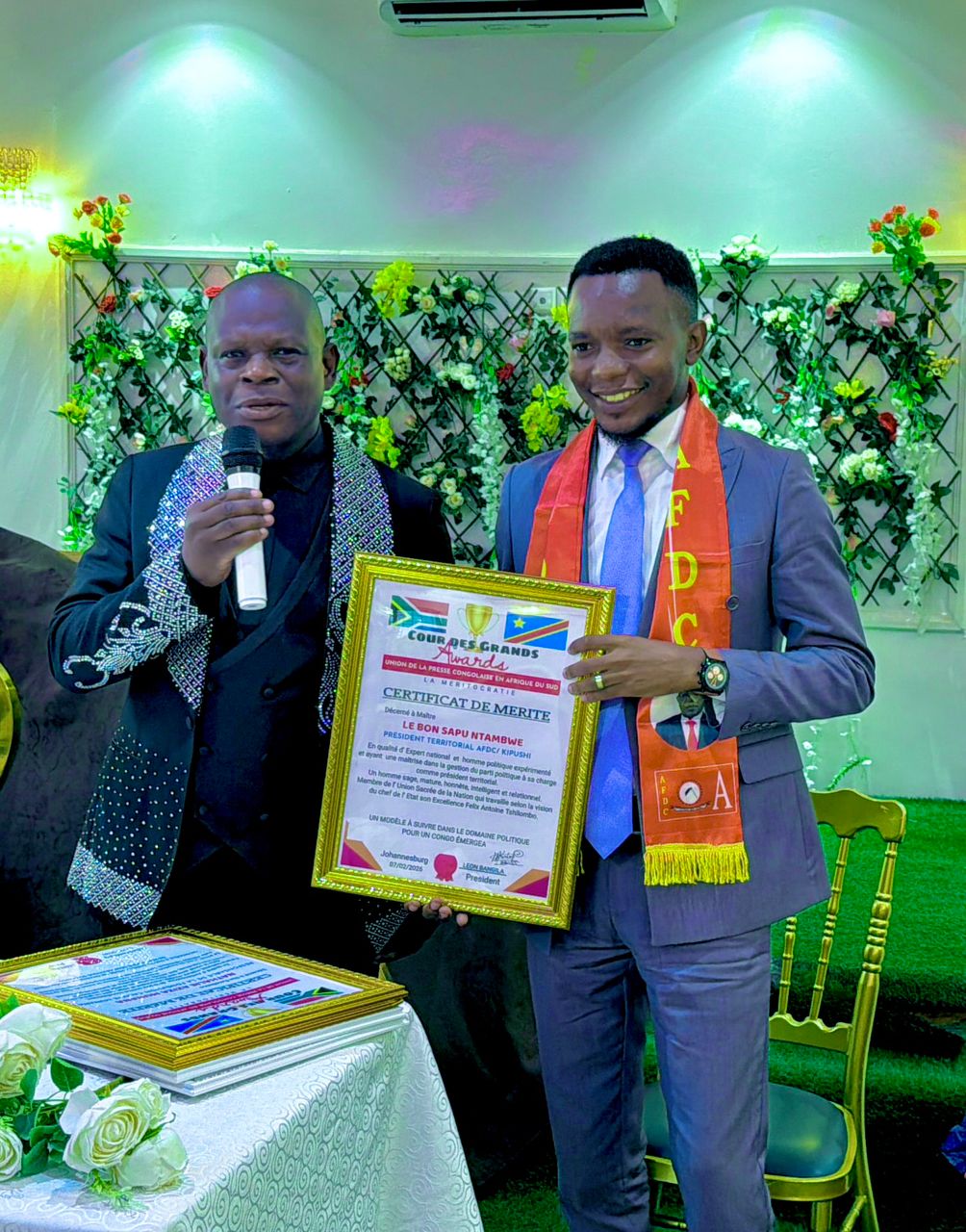 L’Union de la Presse Congolaise en Afrique du Sud, dirigée par M. Léon Bangila, a honoré Me Lebon Sapu, Expert national et Président territorial de l’AFDC/Kipushi.